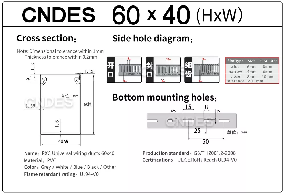 چین میں ایک تجربہ کار کسٹمائزڈ 60×40 فلیم ریٹارڈنٹ PVC وائرنگ ڈکٹ فیکٹری کے طور پر، CNDES یقینی بناتا ہے: