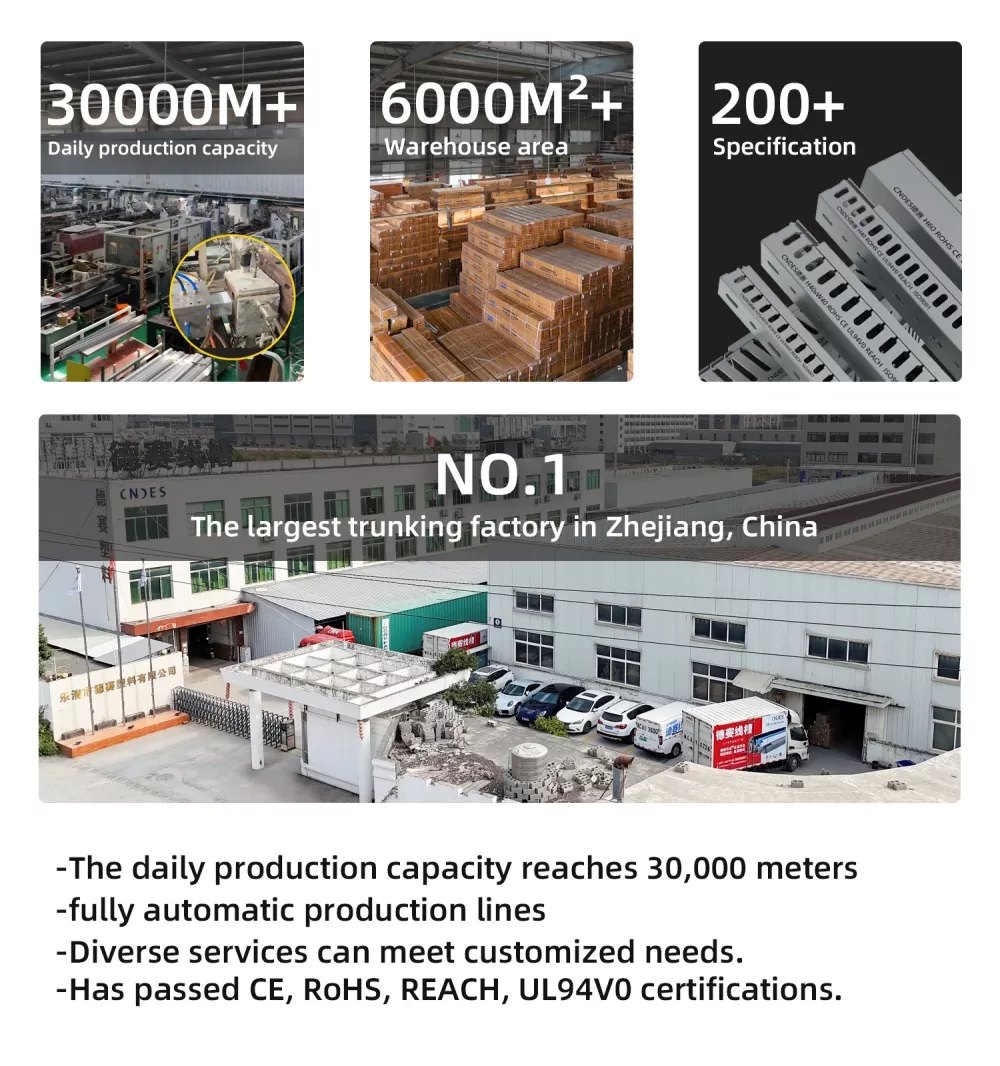 ایک پیشہ ور PVC وائرنگ ڈکٹ مینوفیکچرر کے طور پر، CNDES کے پاس 13 پروڈکشن لائنز، 30000 میٹر تک کی یومیہ پیداوار، اور 200 سے زیادہ تصریحات کی 6000 مربع میٹر گودام انوینٹری کے ساتھ ایک مستحکم سپلائی ہے۔ ہمارا کوالٹی انسپیکشن سسٹم مصنوعات کو سختی سے کنٹرول کرتا ہے: خام مال کی اسکریننگ اور ریئل ٹائم پروڈکشن مانیٹرنگ سے لے کر حتمی بیچ کے نمونے لینے تک، اس بات کو یقینی بناتے ہوئے کہ مصنوعات کی فیکٹری میں خرابی کی شرح 0.5 فیصد سے کم ہے اور ہمیشہ قابل اعتماد ہے۔